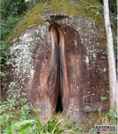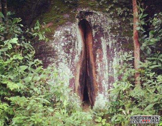 韶關(guān)丹霞山陰陽(yáng)石中的陰元石位于錦江之東,長(cháng)老峰下,遮遮掩掩,藏在幽谷深處,高十多米,闊四米多,形狀酷似待字閨中的少女私處。這怪石有錦江為屏障,有莊重的長(cháng)老峰特別護持,濃蔭密林之中,1998年才被砍柴的農夫發(fā)現。