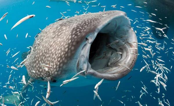 鯨鯊體型大,嘴巴也相當大,寬度可以達到1.5米,但卻有著(zhù)小眼睛和小牙齒,這讓它看起來(lái)并不可怕。平時(shí),鯨鯊主要吃一些浮游生物、巨大的藻類(lèi)和一些比較小的蝦子等,進(jìn)食方式就是先吸入一口水,然后緊閉嘴巴,從鰓里排水,然后浮游生物就會(huì )被困住。