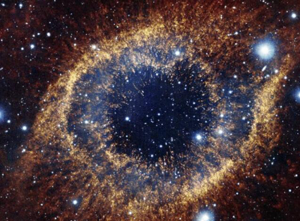 NGC 7293實(shí)際上就是恒星在失去生命之后而產(chǎn)生的螺旋狀星云,恒星的外層被拋入太空當中,在地球上看就是一個(gè)明顯的螺旋狀結構。而星云中間就是恒星死亡后的核心位置,最終會(huì )成為一個(gè)白矮星。在上帝之眼周?chē)€有著(zhù)很多暗紅色的云氣,可能就是死亡恒星最開(kāi)始的噴發(fā)物。