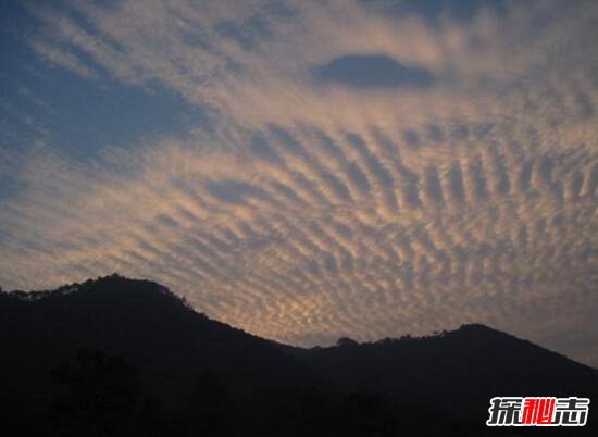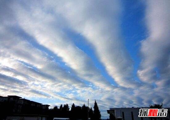 這種云很像飛機飛過(guò)之后留下的痕跡,所以又有人叫做飛機云。一般預示著(zhù)2周后會(huì )有地震;成平行或者放射狀的云又稱(chēng)“排骨云”,現觀(guān)測多為本地地震;而現有觀(guān)點(diǎn)認為放射狀云的震中是其成弧指向的圓心。