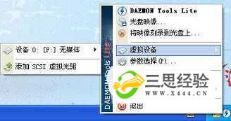 第二步:按照本站文章介紹的步驟安裝完畢虛擬光驅之后,重新啟動(dòng)計算機,在任務(wù)欄右下角找到虛擬光驅圖標,點(diǎn)擊鼠標右鍵,在彈出菜單中選擇“虛擬設備”;
