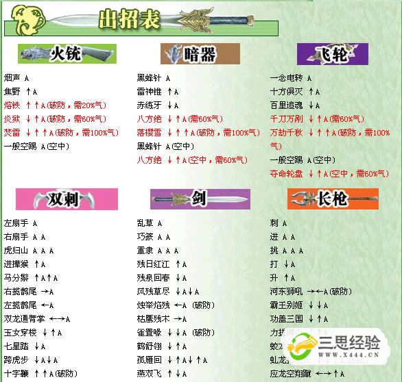 流星蝴蝶劍出招表火槍?zhuān)?煙聲 A 焦野 ↑A 熔鐵 ↑↑A(破防,需20%氣) 炎獄 ↓↑A(破防,需60%氣) 焚雷 ↓↑↑A(破防,需100%氣) 一般空踢 A(空中)飛鏢: 黑蜂針 A 雷神錐 ↑A 赤練牙 ↓A 八方絕 ↓↑A(需60%氣) 落櫻雪 ↓↑↑A(破防,需100%氣) 黑蜂針 A(空中) 八方絕 ↓↑A(空中,需60%氣)飛輪: 一念電轉 A 十方俱滅 ↑A 百里追魂 ↓A 千刀萬(wàn)剮 ↓↑A(需60%氣) 萬(wàn)劫千秋 ↓↑↑A(破防,需100%氣) 一般空踢 A(空中) 奪命輪盤(pán) ↓↑A(空中,需60%氣)雙刺: 左扇手 A 右扇手 A A 虎歸山 A A A 進(jìn)攆猴 ↑A 馬分鬃 ↑A↑A 右攬鵲尾 →A 左攬鵲尾 ←A 雙龍通臂掌 ←→A 玉女穿梭 ↓↑A 七星踏 ↓A 跨虎步 ↓A↓A 十字鞭 ↑↑A(破防) 祥龍擺尾 ←→↑A(需60%氣) 乘風(fēng) ↓↓↑A(加速,需60%氣) 合太極 ↓←→A(破防、吸氣,需100%氣) 小獅戲珠 A(空中) 右擺蓮 A A(空中) 穿云腳 ↑A(空中) 單鞭腿 ↑A↑A(空中) 湖探月 ↓A(空中) 海底針 ↓A↓A(空中)劍: 亂草 A 巧篆 A A 重隸 A A A 殘日紅江 ↑A 殘泉回春 ↓A 風(fēng)殘草盡 ↓A↓A 燭舉焰殘 ←A (破防) 枯鷹殘木 →A 雀置喙 ↓↓A (破防) 鶴舒翎 ↓↑A 孤雁回 ↓↑A↓↑A 燕雙飛 ↑↓A 忌夏日 ↑↑A 忌秋風(fēng) ↑↑A↑↑A 忌冬雨 ↓↑↑A 鳳凰雛 ←→A(需60%氣) 血殘氣喪 →←A(需60%氣) 鳳凰羽 ←→↑A (破防,需100%氣) 輕行 A(空中) 正楷 A A(空中) 刻銘 ↓A(空中)長(cháng)槍?zhuān)?刺 A 進(jìn) A A 挑 A A A 打 ↓A 升 ↑A