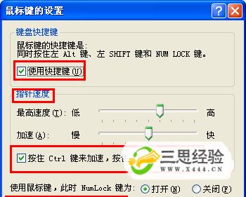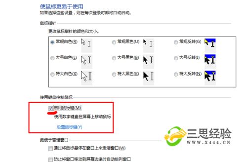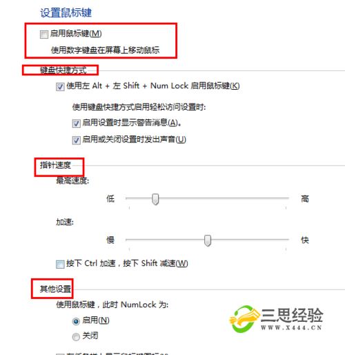 默認情況下,打開(kāi)鍵盤(pán)控制鼠標的快捷鍵是啟用的??旖萱I為:Alt(左)+Shift+NumLock 即可進(jìn)入 鍵盤(pán)控制鼠標 面板。隨后的設置方式如上面的步驟所示。
