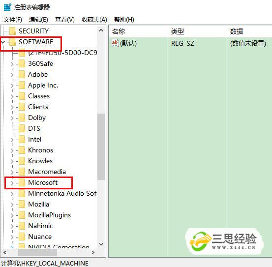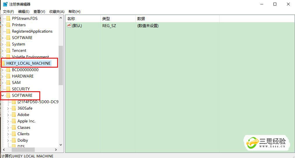 在左側列表中找到HKEY-LOCAL-MACHIINE,點(diǎn)擊它,再找到SOFTWARE,點(diǎn)擊它。