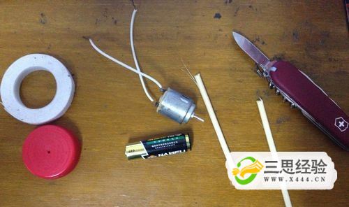 把一次性筷子像圖中那樣綁在蓋子兩邊,要對稱(chēng),否則轉起來(lái)可能不穩定